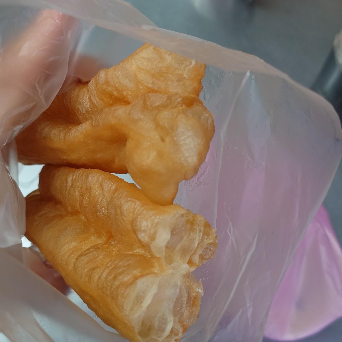 油條,包飯糰的是老油條,現吃的都是嫩油條,熱量炸彈!夾在燒餅裡面,再沾豆漿打蛋……好好吃。
