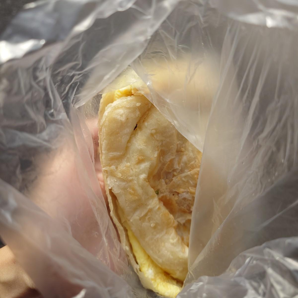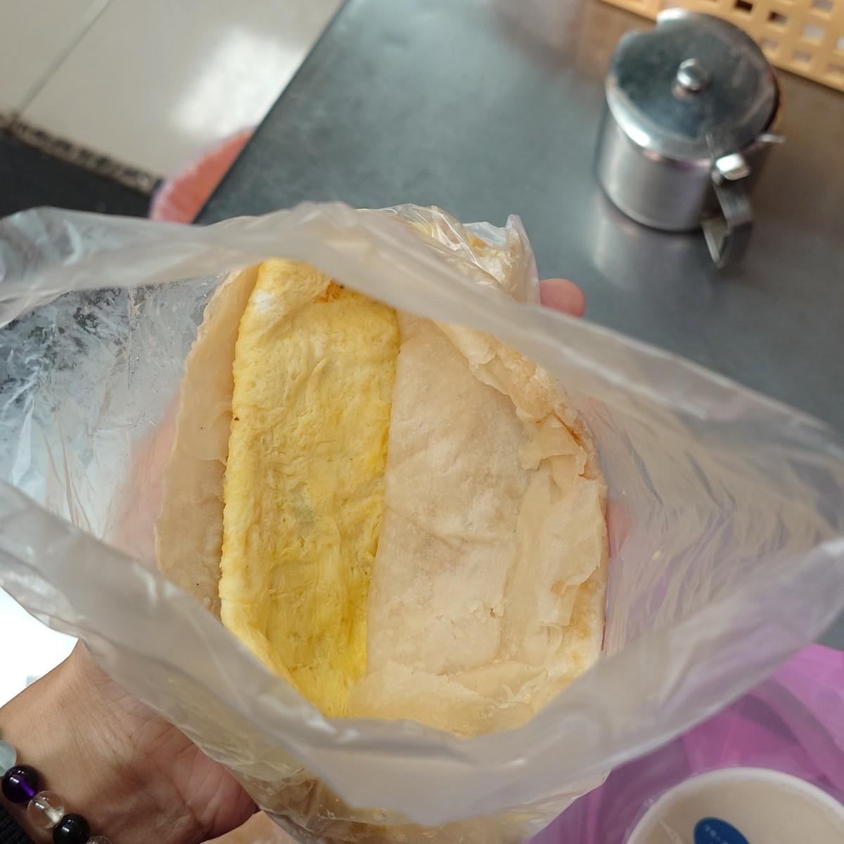 燒餅蛋,燒餅是軟式燒餅,裡面的蛋偶爾會有蔥……,咬下去的口感是濕軟的,淋上旁邊的調味,(吃辣的可以自己加特制辣椒,很好吃,以上是我吃辣的同事說,非常的讚。)個人比較喜歡淋上醬油糕帶點略鹹的口感,提高它的味道。