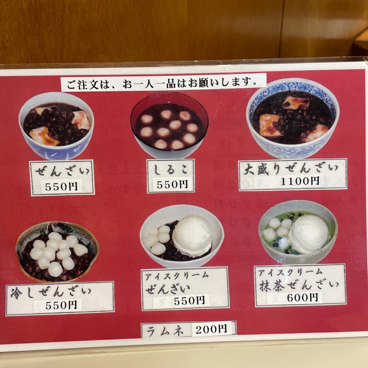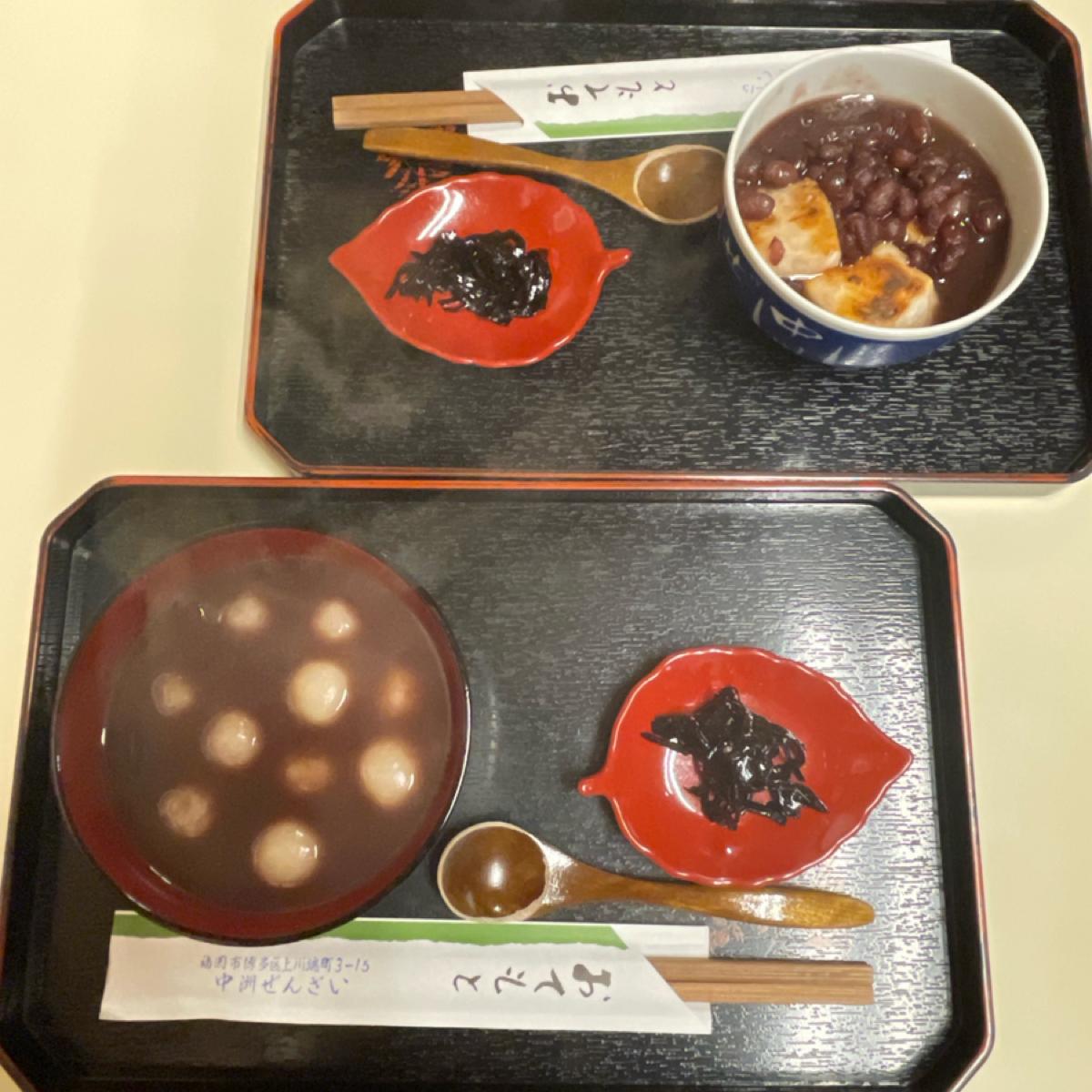 一入店老闆就先為我們送上熱茶,這邊每人至少要點一樣商品,我們點了一碗招牌烤麻糬紅豆湯(ゼんざい)及紅豆湯湯圓(しろこ),都是熱的