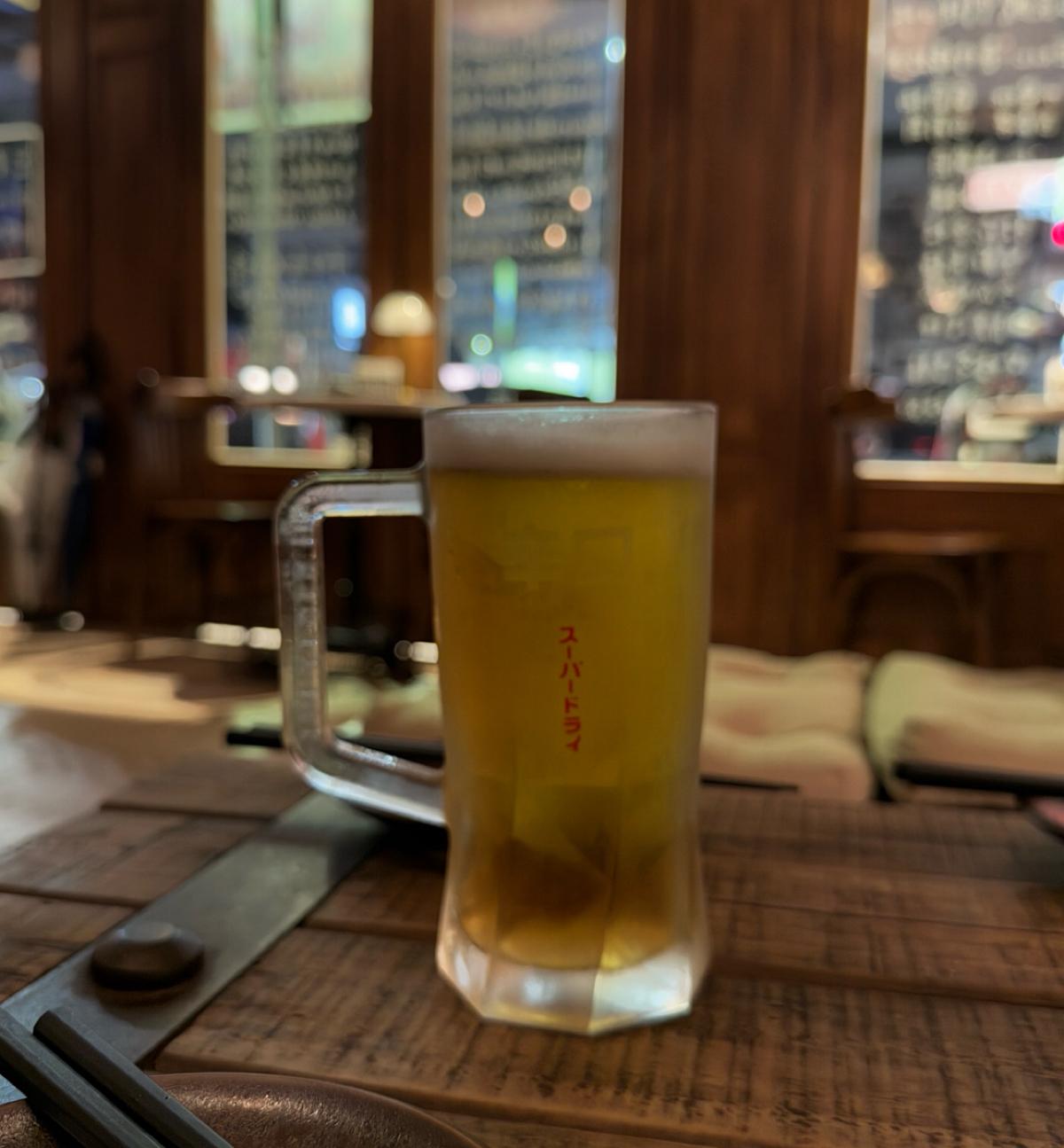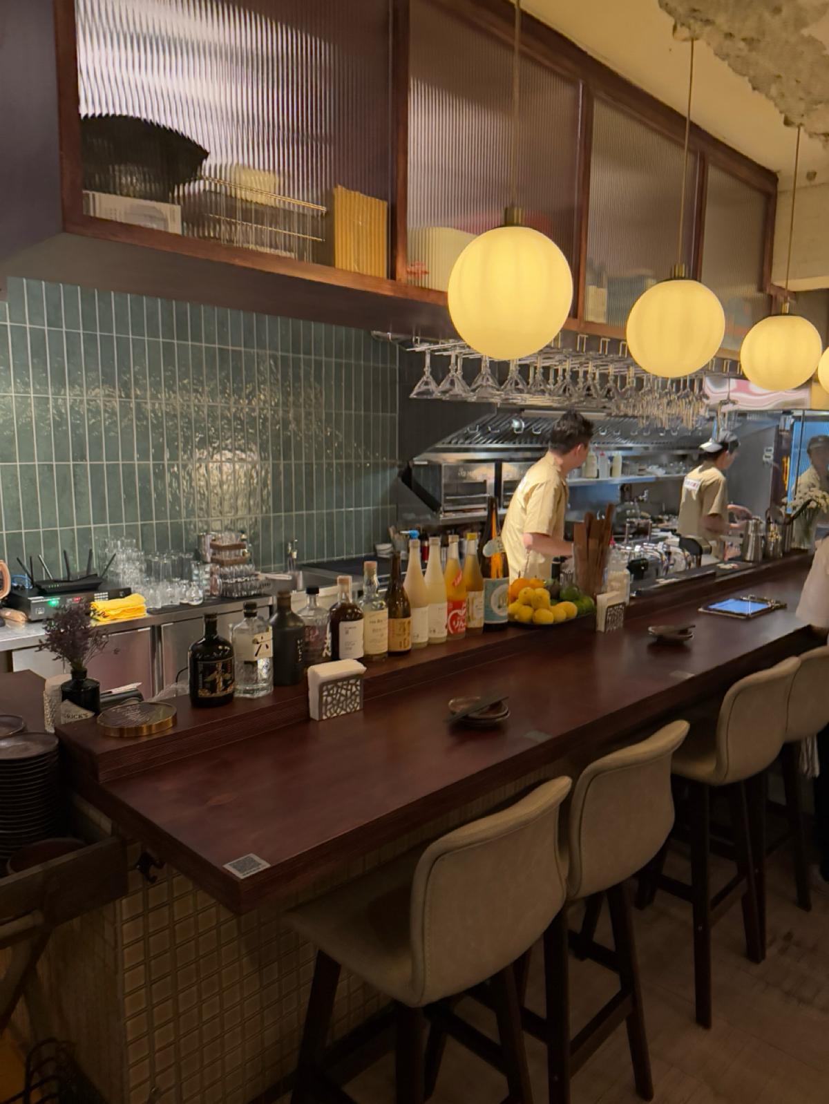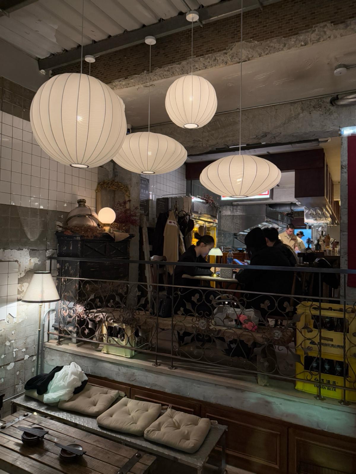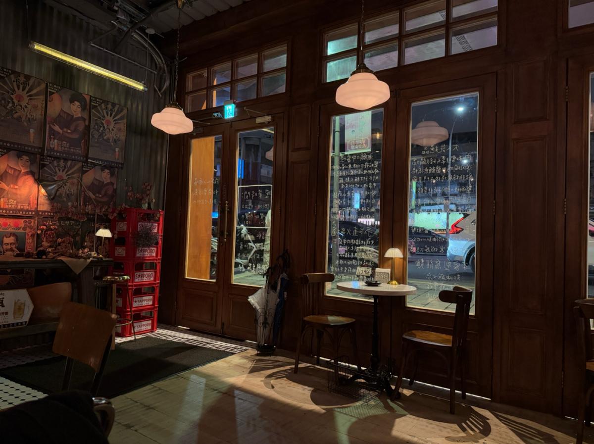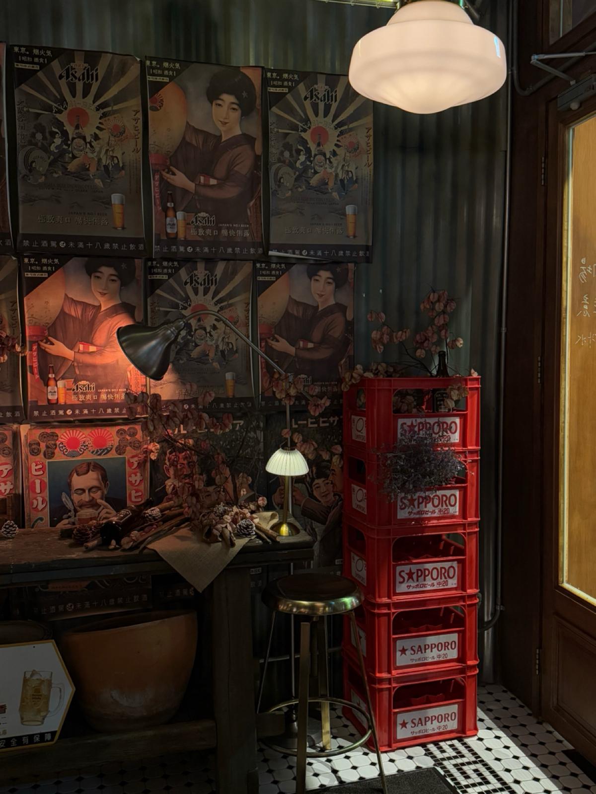 主打的是日式的居酒屋料理跟酒品,主要都是串烤類跟日式料理。飲料則是有生啤、日本酒、調酒等。店面裝潢的非常復古,很有昭和洋風的感覺,一進店就瘋狂拍照,特別喜歡靠近店門口的地方,裡面橙黃色溫暖微弱的市內燈光,錯落的裝飾被店外五光十色的燈光映照著,非常有氛圍~