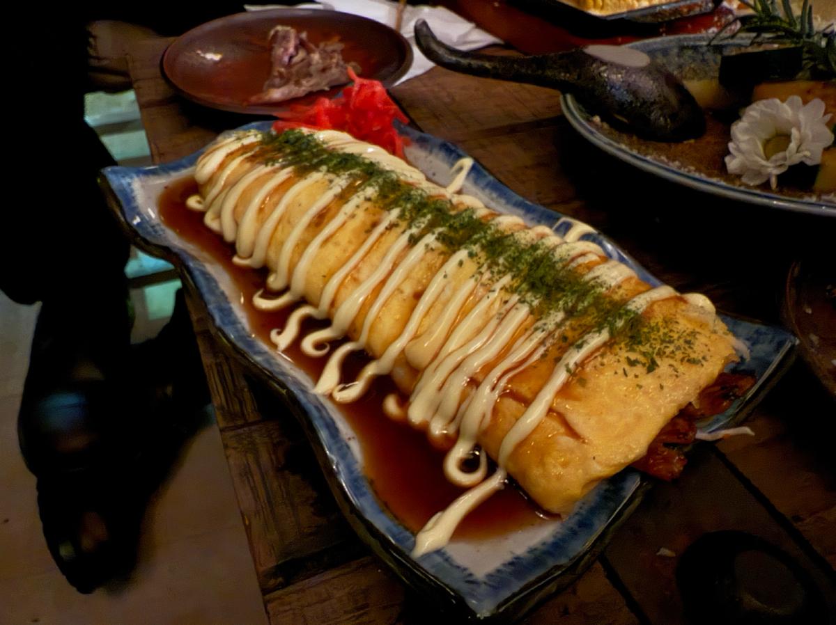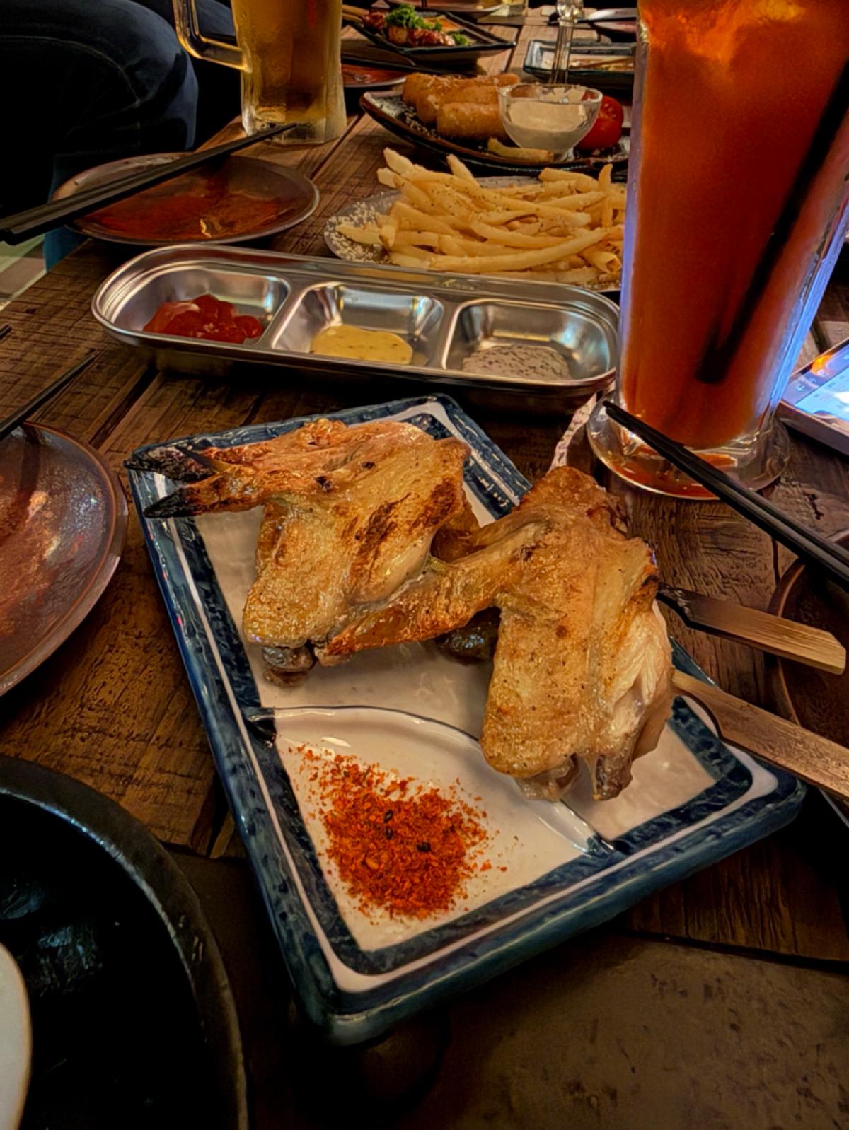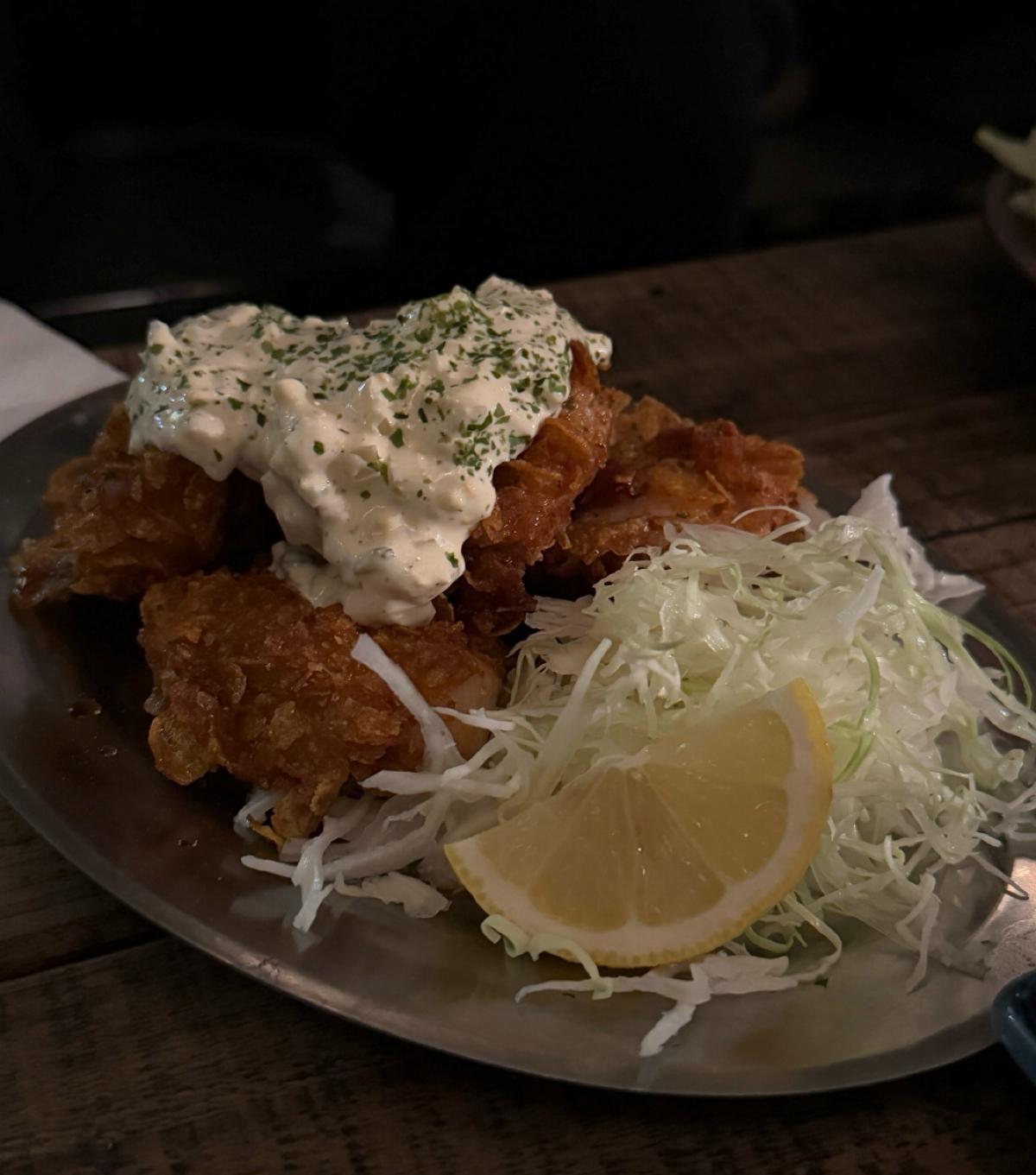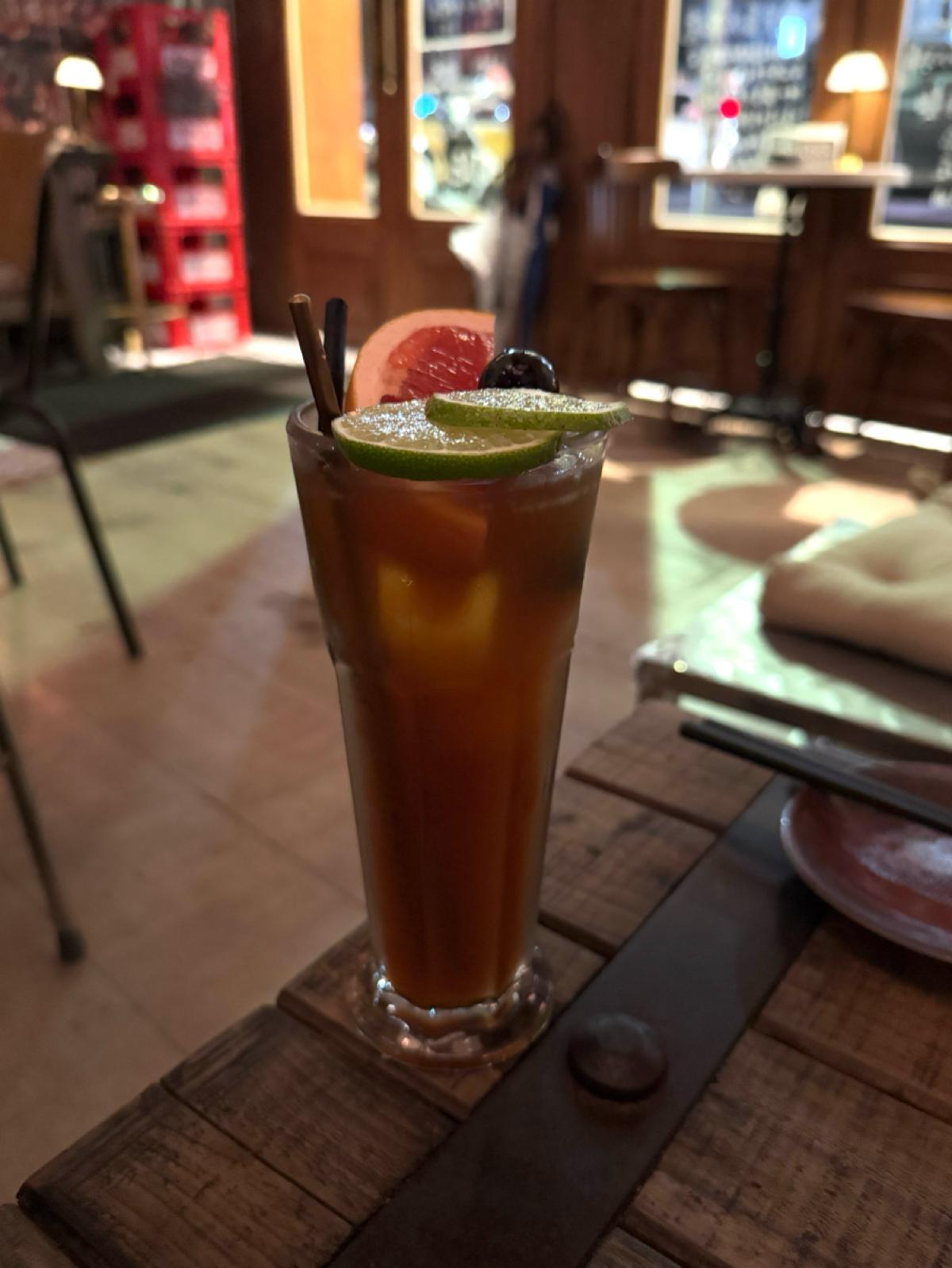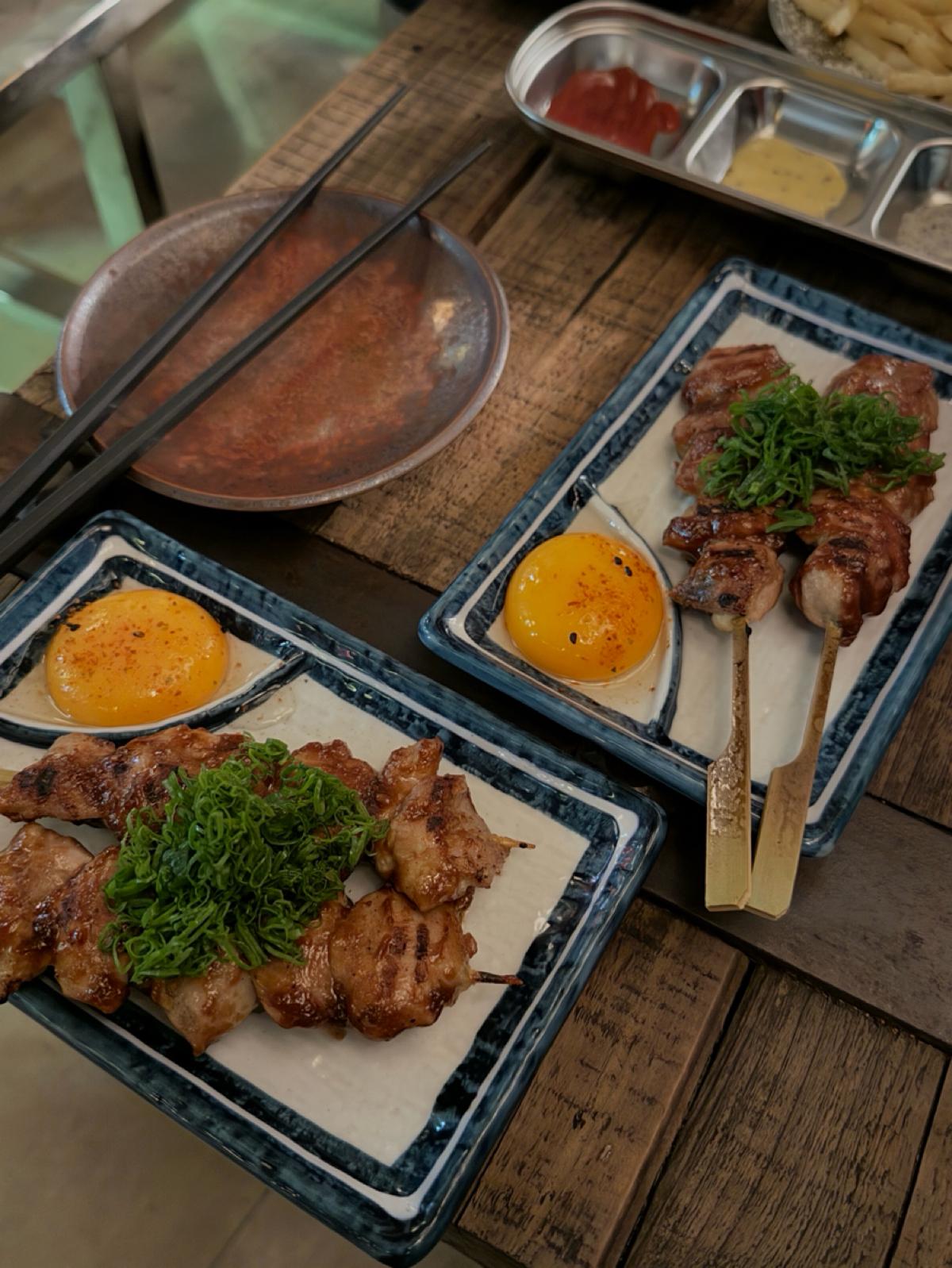 主打的是日式的居酒屋料理跟酒品,主要都是串烤類跟日式料理。飲料則是有生啤、日本酒、調酒等。店面裝潢的非常復古,很有昭和洋風的感覺,一進店就瘋狂拍照,特別喜歡靠近店門口的地方,裡面橙黃色溫暖微弱的市內燈光,錯落的裝飾被店外五光十色的燈光映照著,非常有氛圍~