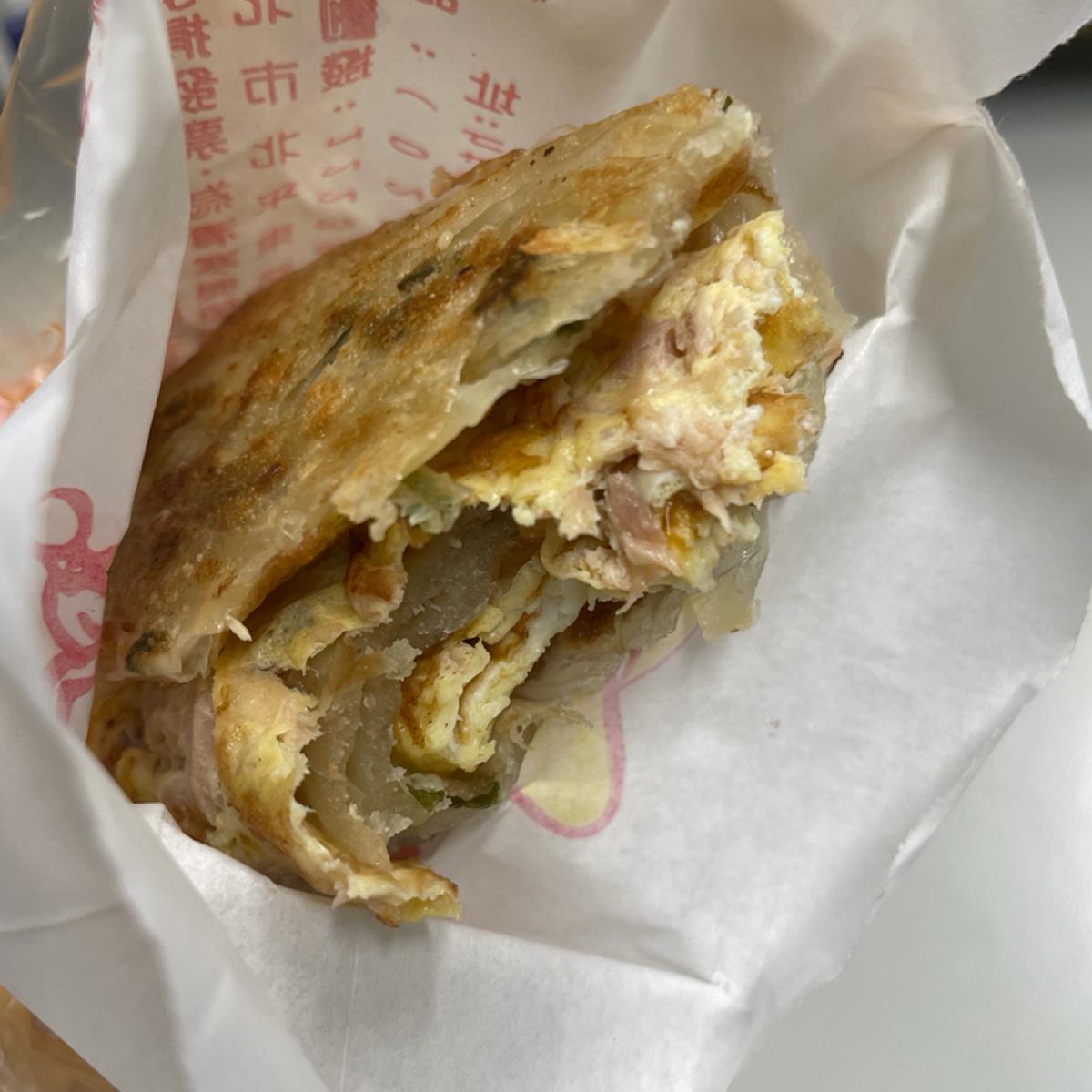 餅皮煎得蠻香的,但覺得可以再脆一點;鮪魚是直接用鮪魚罐頭,沒有另外加美乃滋調成鮪魚沙拉,鮪魚直接拌入蛋液當中,煎成鮪魚蛋再跟蔥抓餅結合,不過我覺得鮪魚份量有點少…有點可惜~