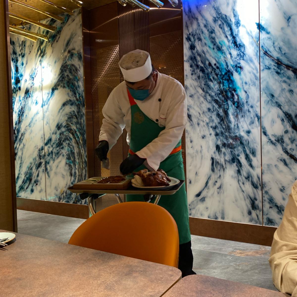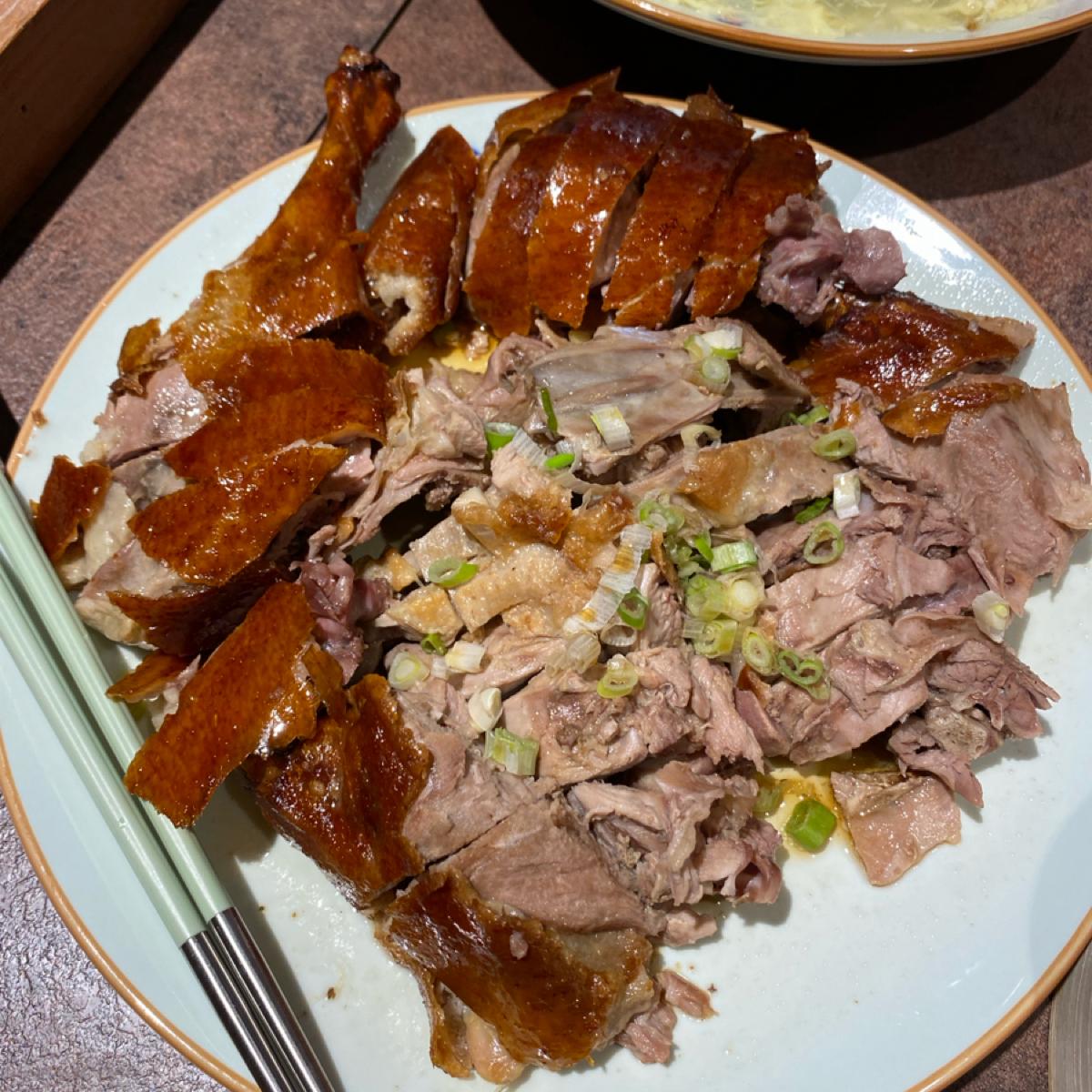 烤櫻桃全鴨跟木桶豆花需要預訂,烤鴨會在客人面前片一盤鴨皮,鴨腿會切一份肉盤,剩下部位的肉可以選擇跟高麗菜炒,或者是用豆芽菜芋頭絲去炒,鴨骨頭可以選擇煮粥或是煮湯。餅皮會在桌上擺瓦斯爐與蒸籠加熱過,跟片皮一樣很有表演性質,餅皮包著鴨皮、黃瓜絲、大蔥絲,再沾一些甜麵醬,因為皮的油脂很多,最好沾多點醬比較不膩,鴨皮非常酥脆,但是味道完全由甜麵醬主導沒什麼特別處。鴨腿上面會帶脆皮,一樣推薦沾醬吃。