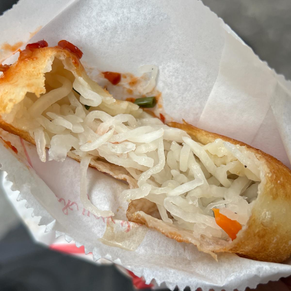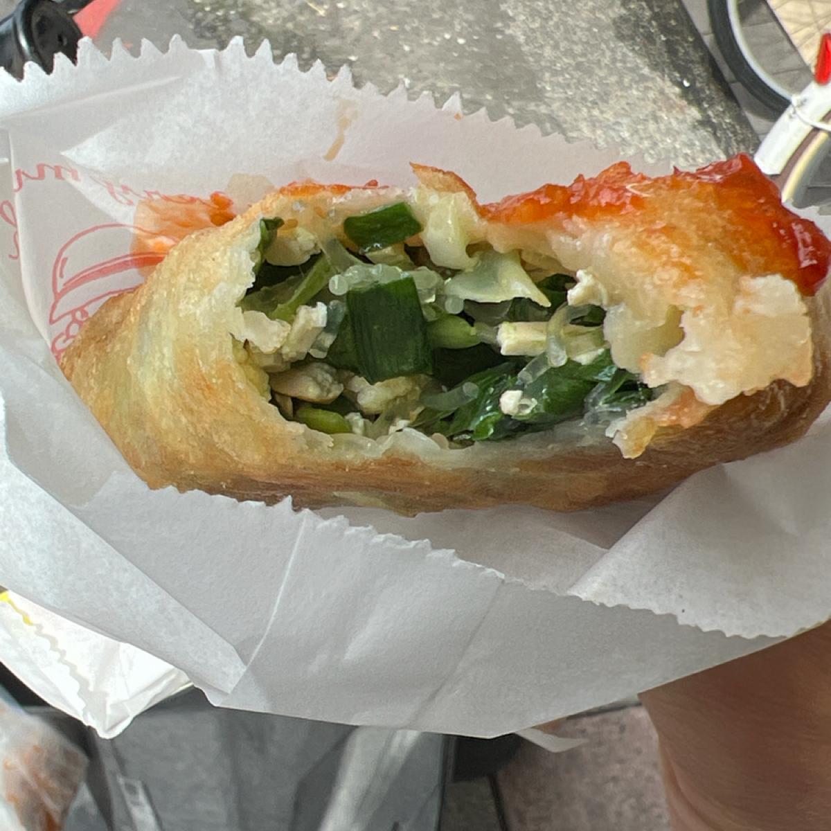 現場包製,現場煎炸,內餡飽滿,外皮酥Q,買了直接現場吃,韭菜盒一個咬下去,‘’驚艷‘’好好吃啊~韭菜冬粉豆乾幾口就吃完了,馬上繼續吃蘿蔔絲餅,內餡非常實在但味道相對有一點淡,如果再有風味一點就完美了,一個沒有很大所以就再去買一個高麗菜盒的試試,也是不錯吃,無糖豆漿也很濃郁。整體都很推薦但是第一名韭菜盒真的是非常的好吃啊。