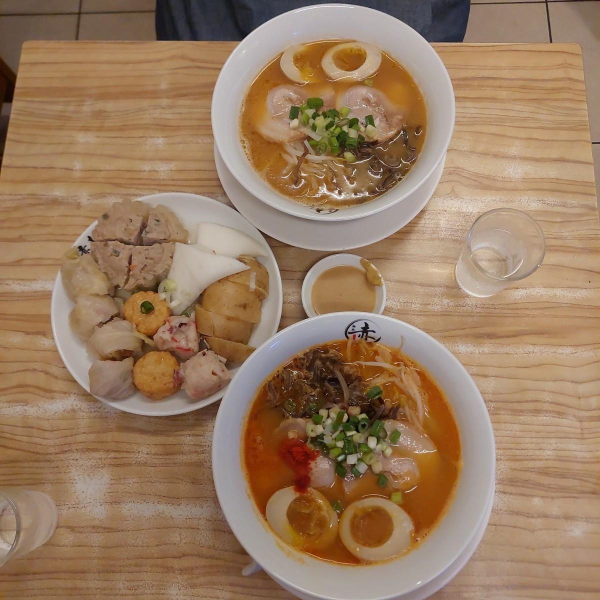 今天享用的是激辛豚骨拉麵、藤原味噌拉麵、跟自選的綜合關東煮,合計大約是700元左右。