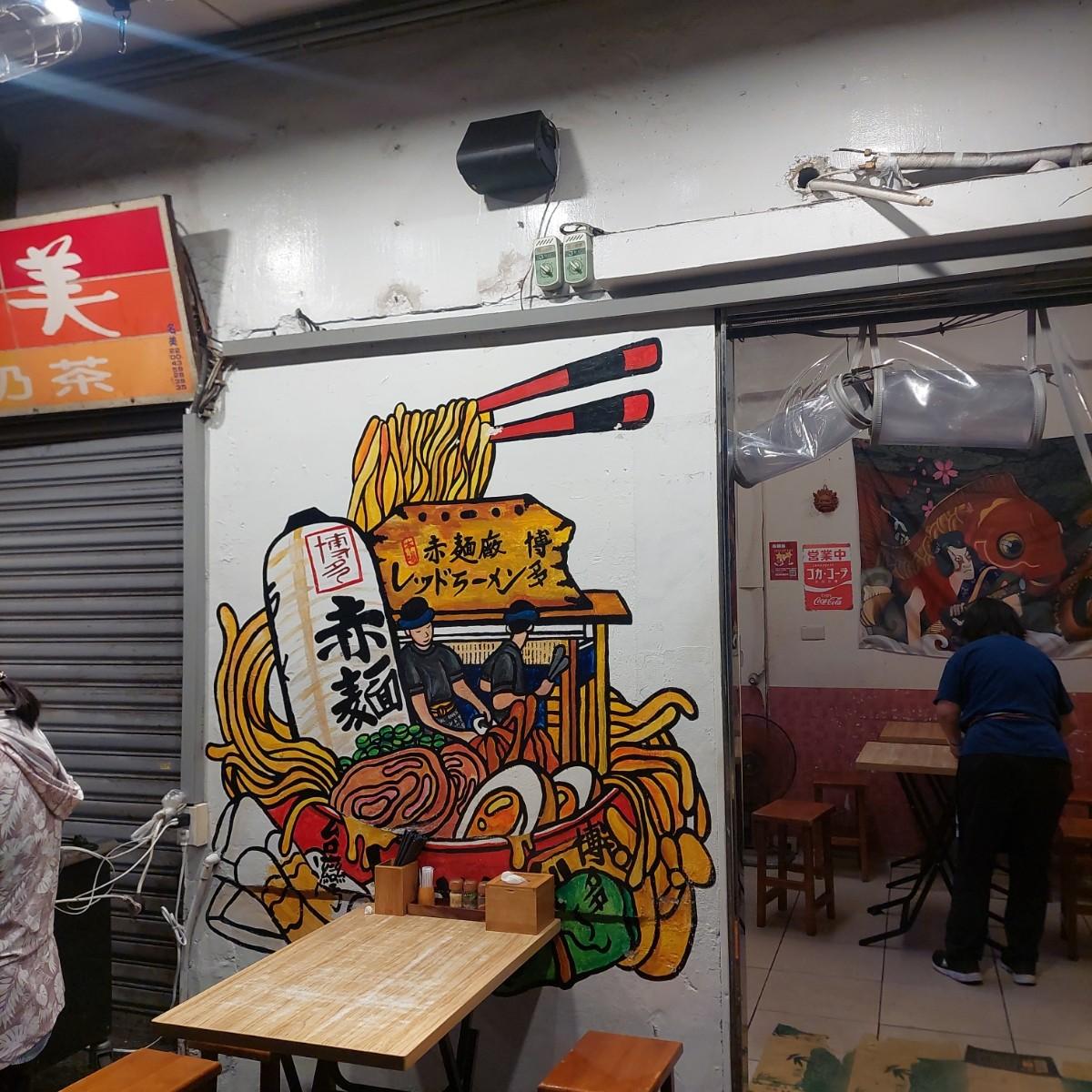 博多赤麵廠位於四維夜市中段,剛好在下新莊的另一家夜市拉麵店丸吉左衛門正對面的巷內。