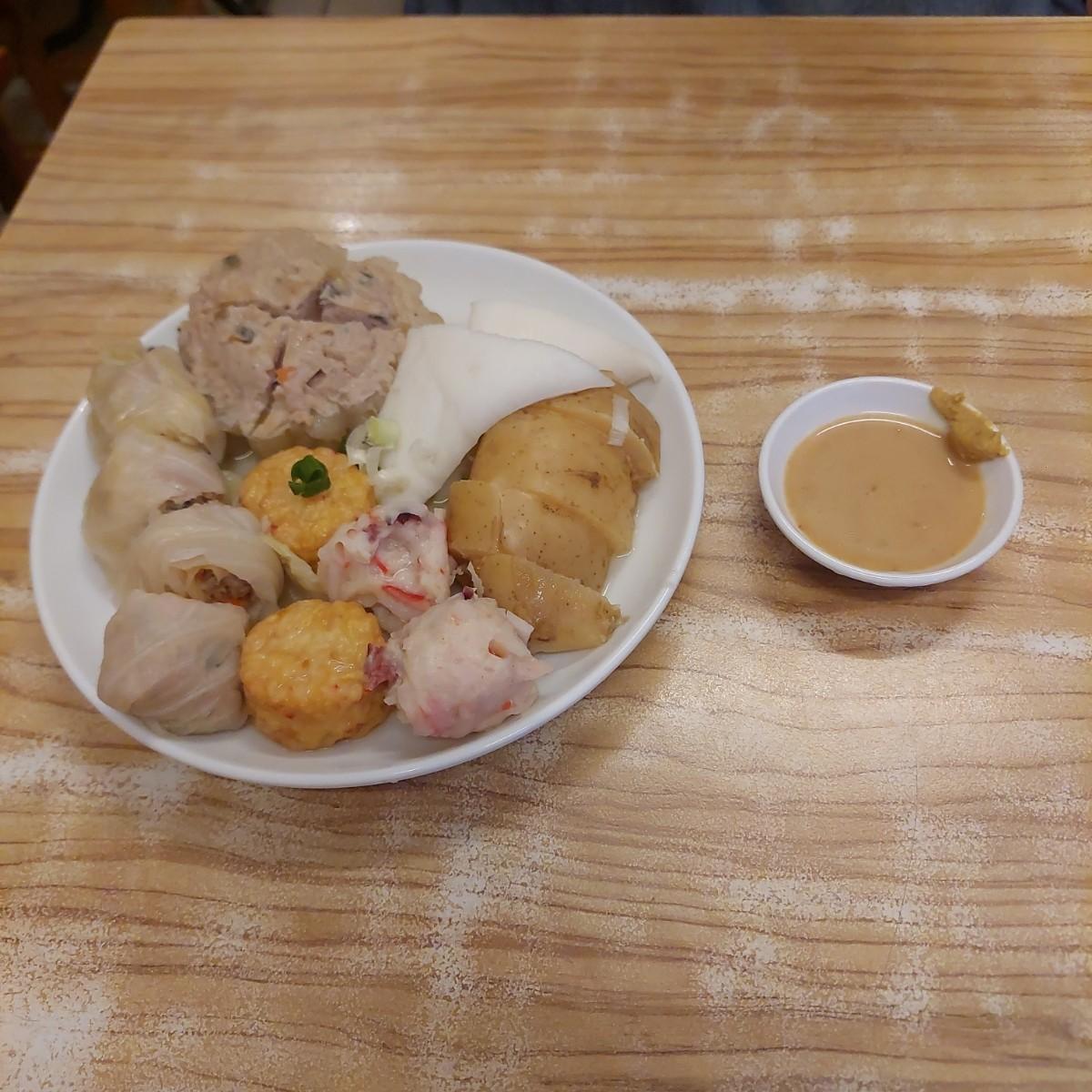 綜合關東煮配上店家提供的醬料沾取,相當溫和美味。