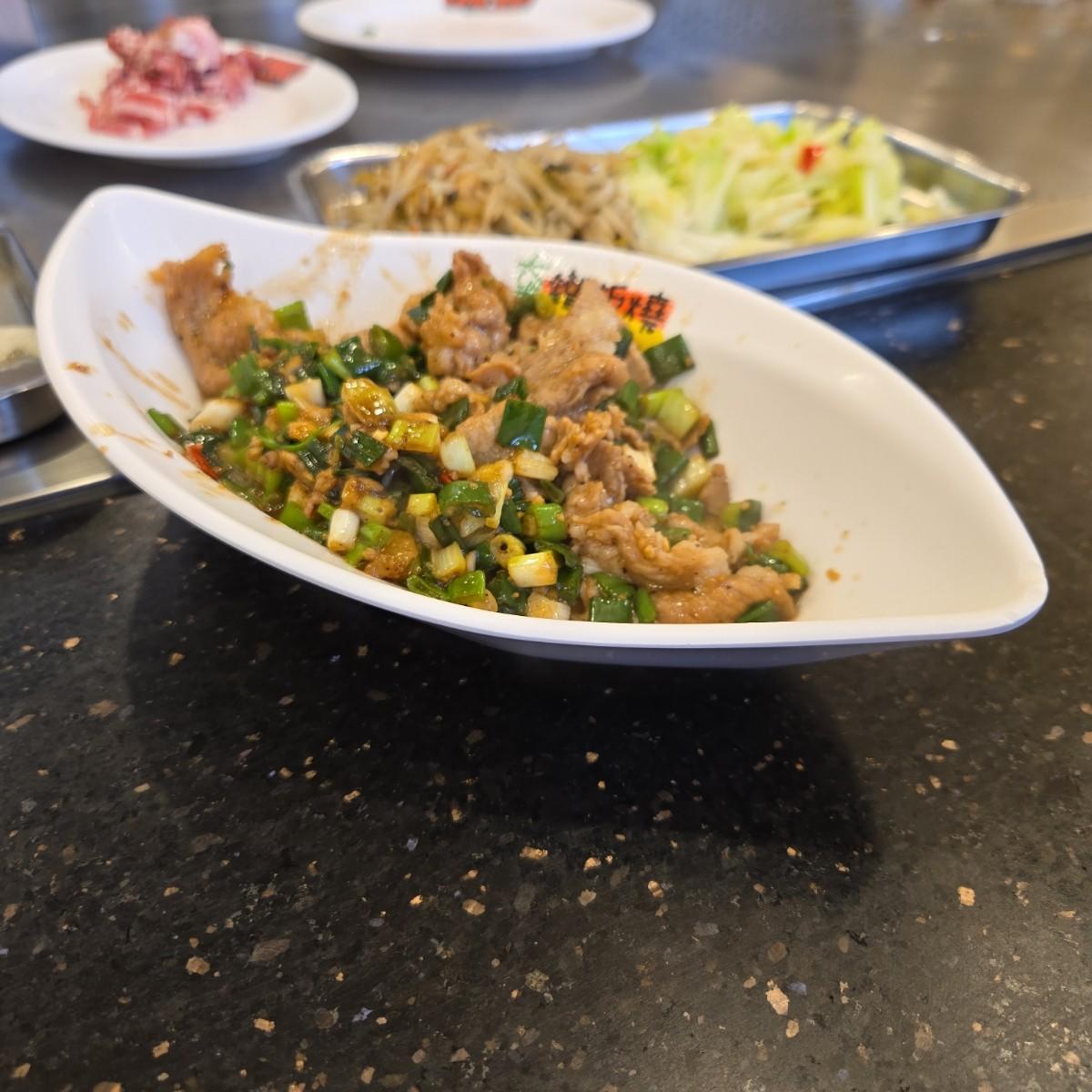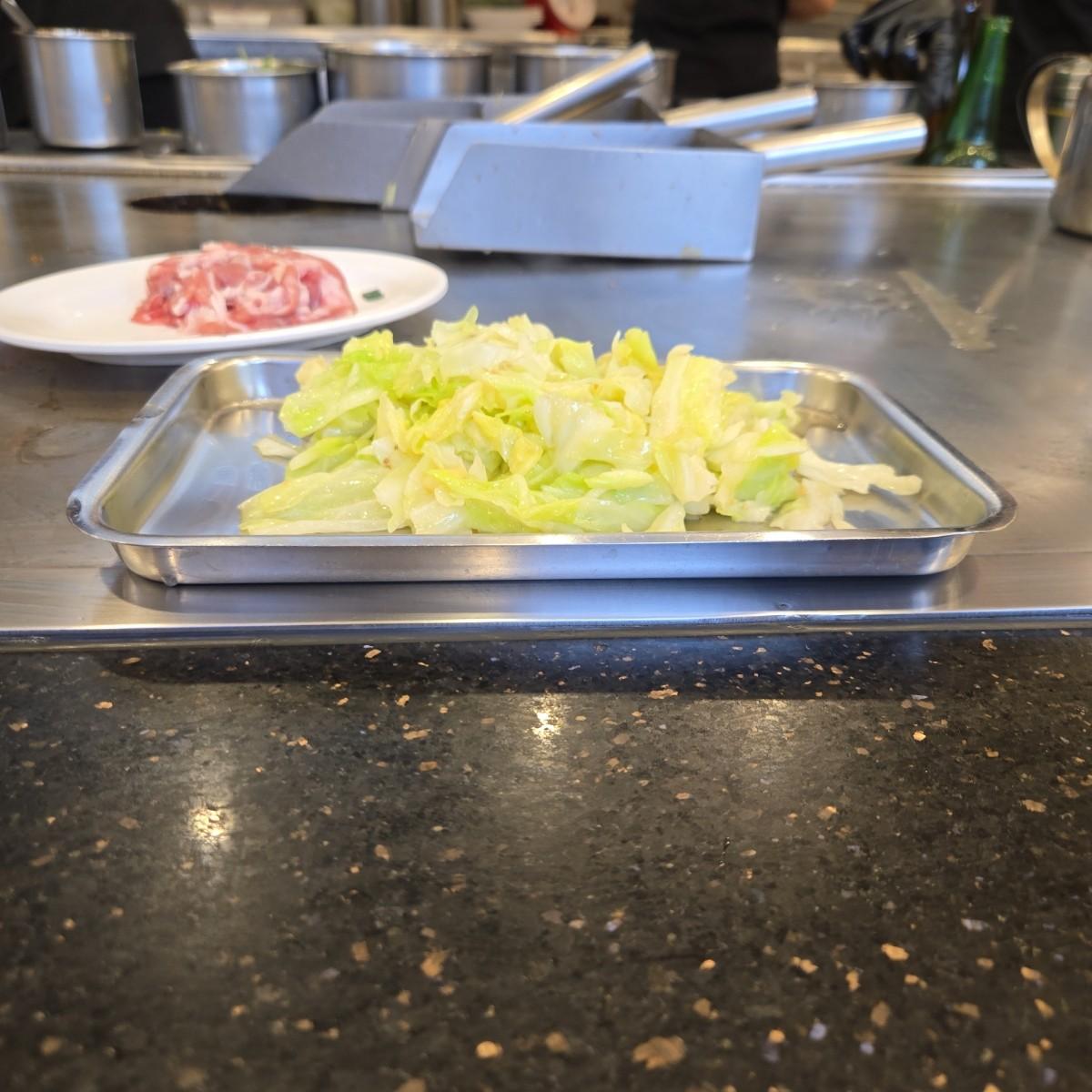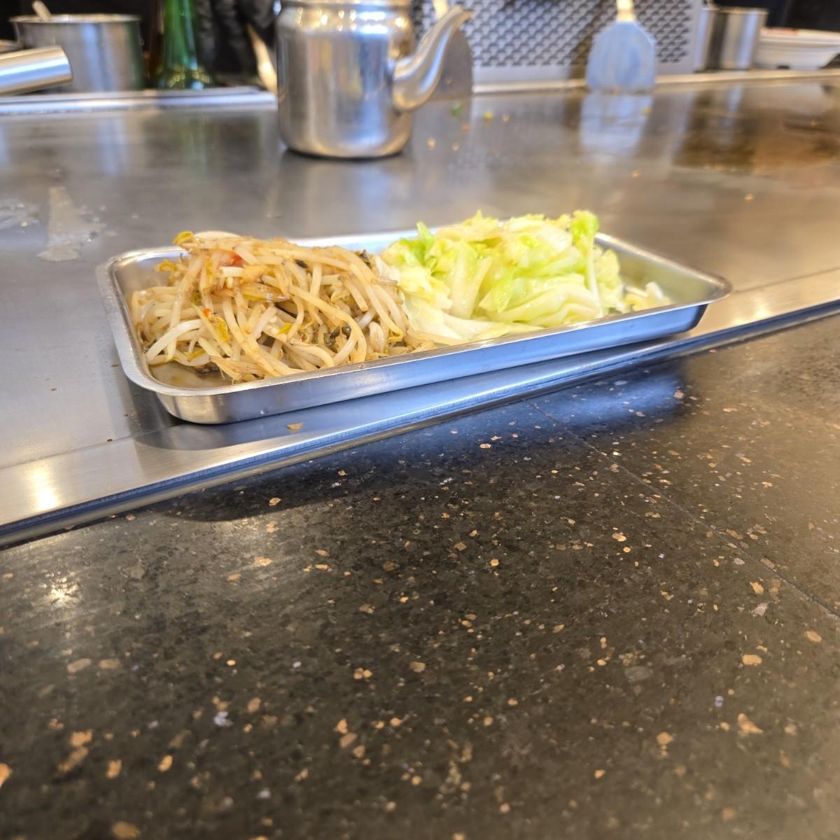 青菜的部分有高麗菜和豆芽菜(鐵板燒的固定配菜XD