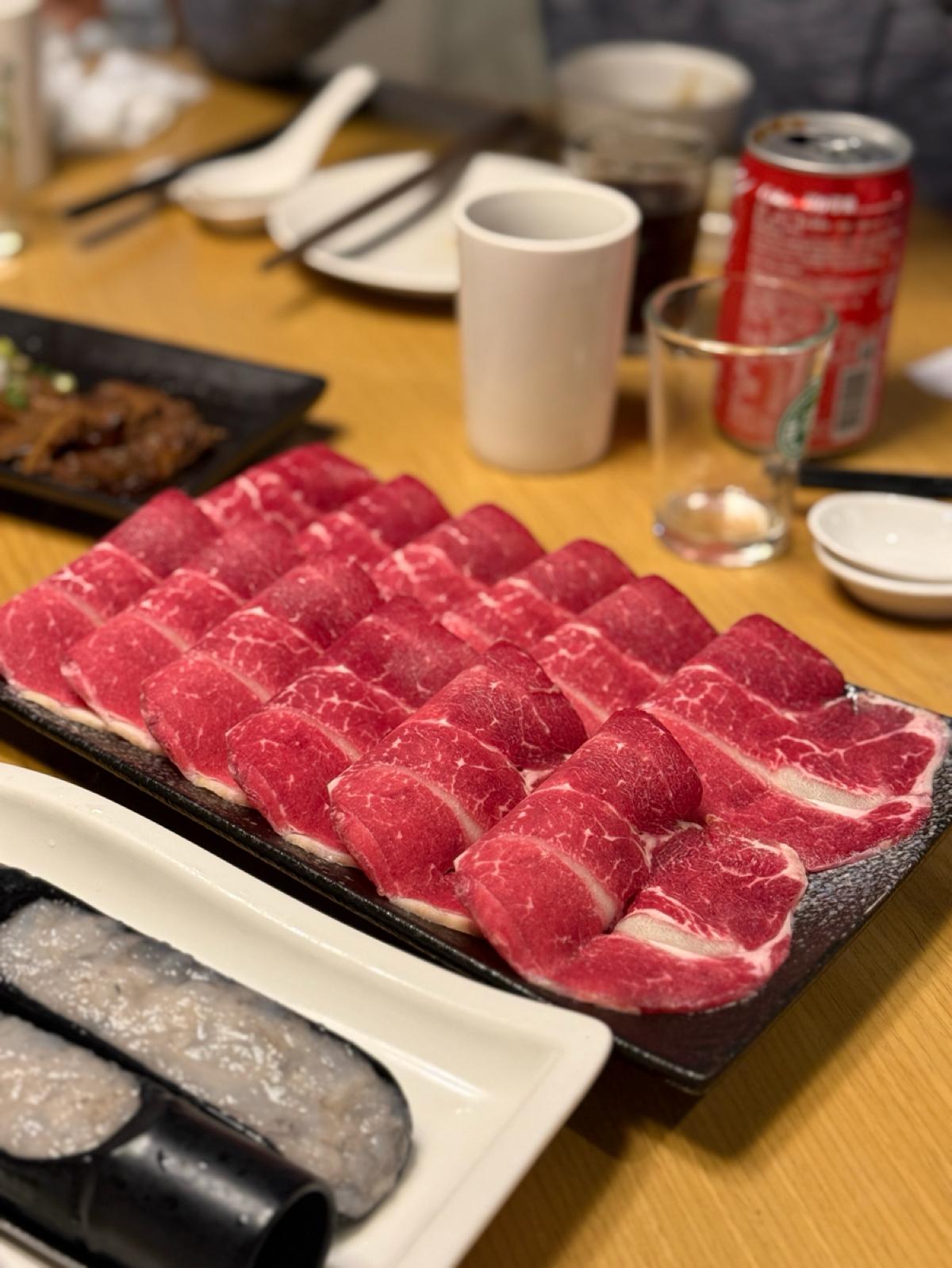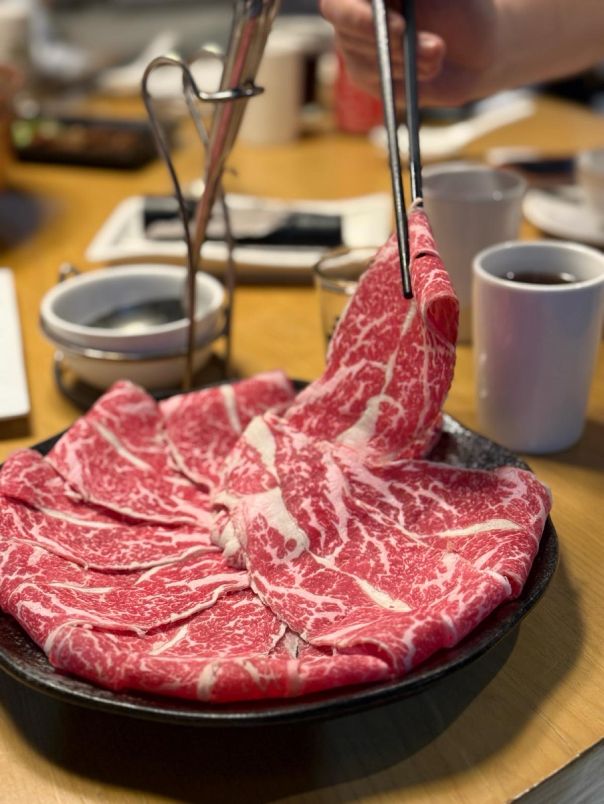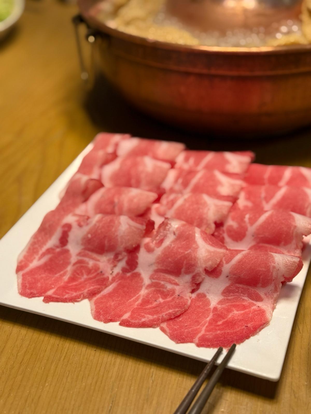 帶皮五花肉是酸菜白肉鍋的主角,肉質鮮嫩好吃,皮的部分很內斂,不會搶走肥肉跟瘦肉的風采。松阪豬肉片反而肉質普通,吃起來偏硬。梅花肉的味道跟肉質也不錯。沙朗牛跟牛小排肉質都有在水準以上。