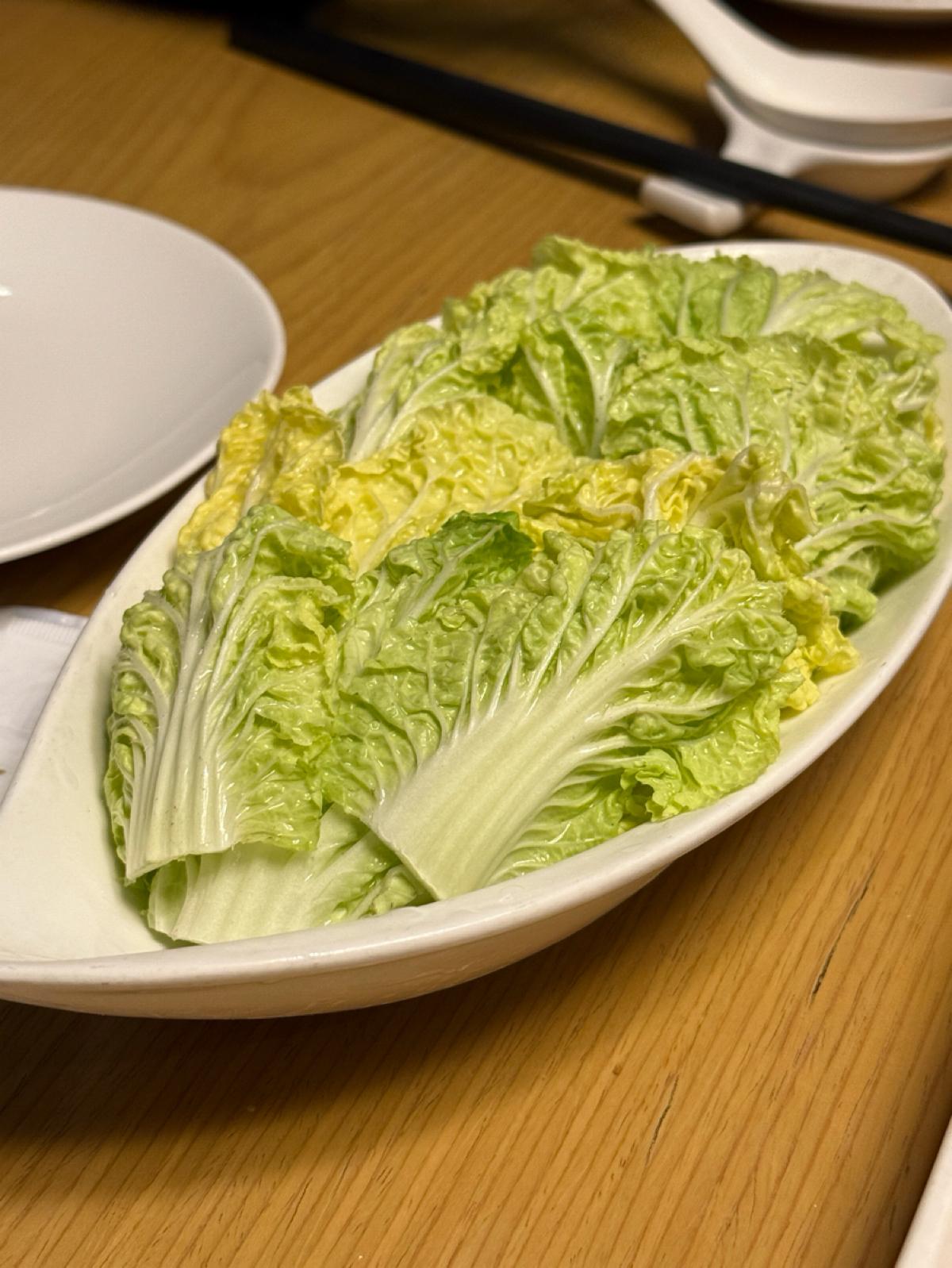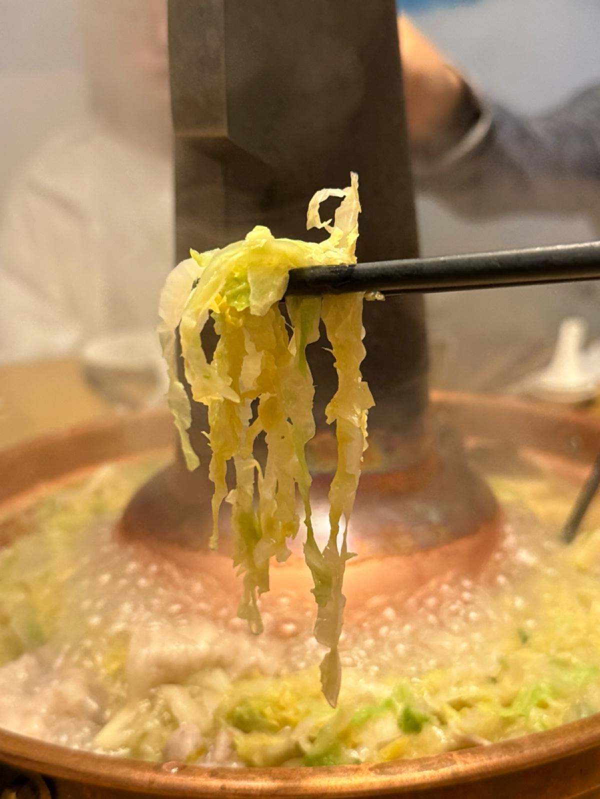 酸菜夠酸,層次分明,且湯頭越煮越濃郁。鍋裡的酸菜量很多,就算一直吃到最後鍋裡也都還有剩。喜歡酸菜白肉鍋的人因為不會對湯底感到失望。