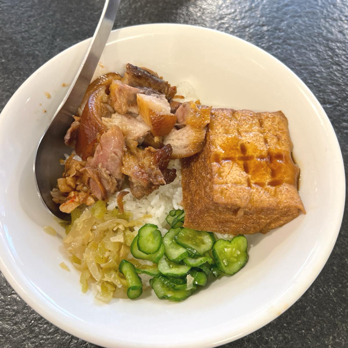 豬腳飯配有煮豆腐和醃黃瓜,份量足夠且豬腳大塊,但骨頭多需小心。味道普通,魯肉飯和豬腳飯未有特別驚艷之處。